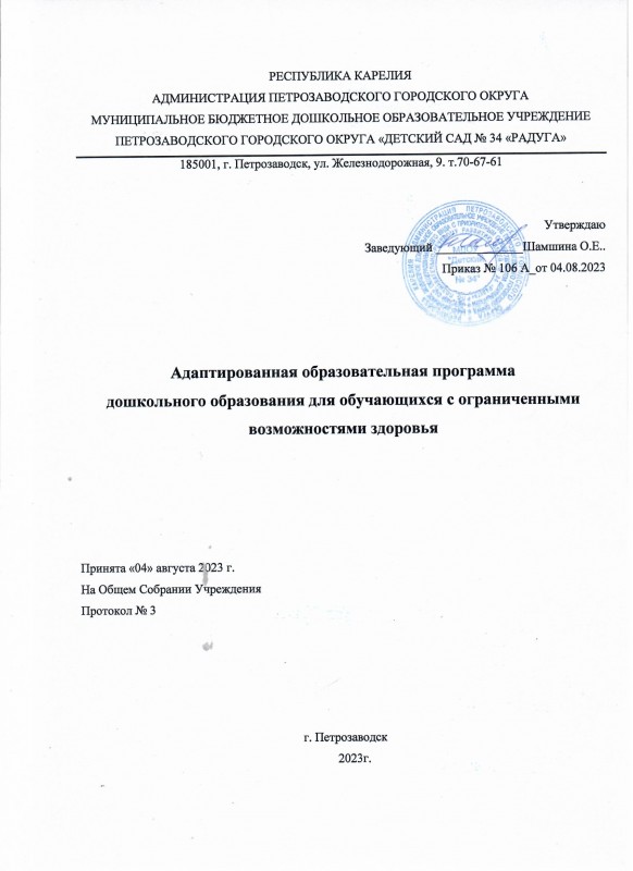 Основная общеобразовательная программа (далее – Программа) дошкольного образовательного учреждения «Детский сад общеразвивающего вида с приоритетным осуществлением деятельности по познавательно-речевому развитию детей №34» (далее МДОУ «Детский сад №34») разработана в соответствии с Федеральной образовательной программой дошкольного образования (далее ФОП ДО) (приказ Министерства просвещения Российской Федерации от 25.11.2022 № 1028 «Об утверждении федеральной образовательной программы дошкольного образования» (зарегистрирован Министерством юстиции Российской Федерации 28.12.2022 № 71847)), Федеральными государственными образовательными стандартами дошкольного образования (Приказ от 17.10.2013г. №1155; далее ФГОС ДО).