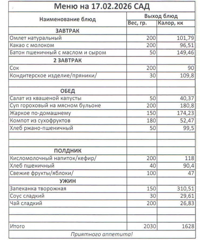 Меню на 17.02.2026 (сад)