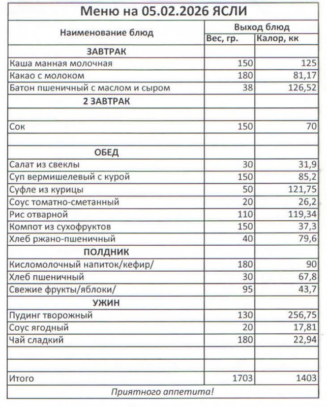 Меню на 05.02.2026 (ясли)