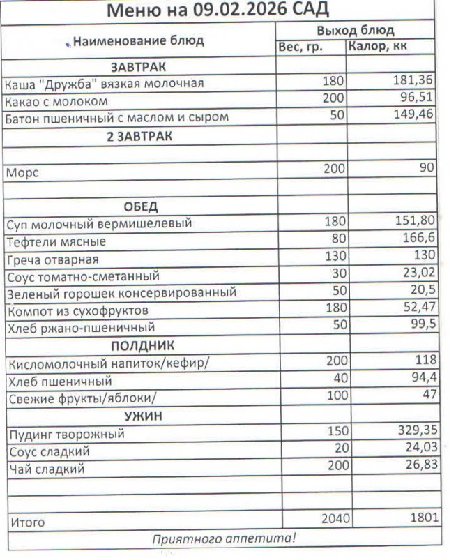 Меню на 09.02.2026 (сад)
