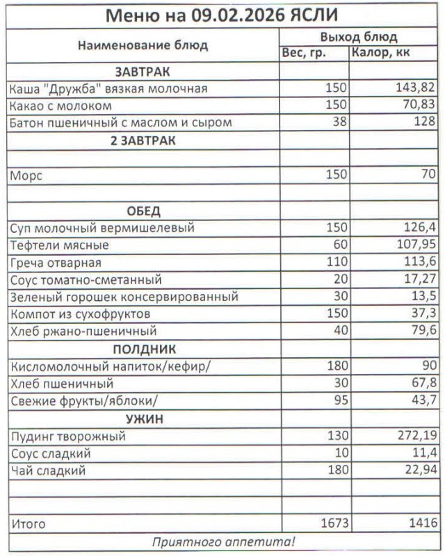 Меню на 09.02.2026 (ясли)