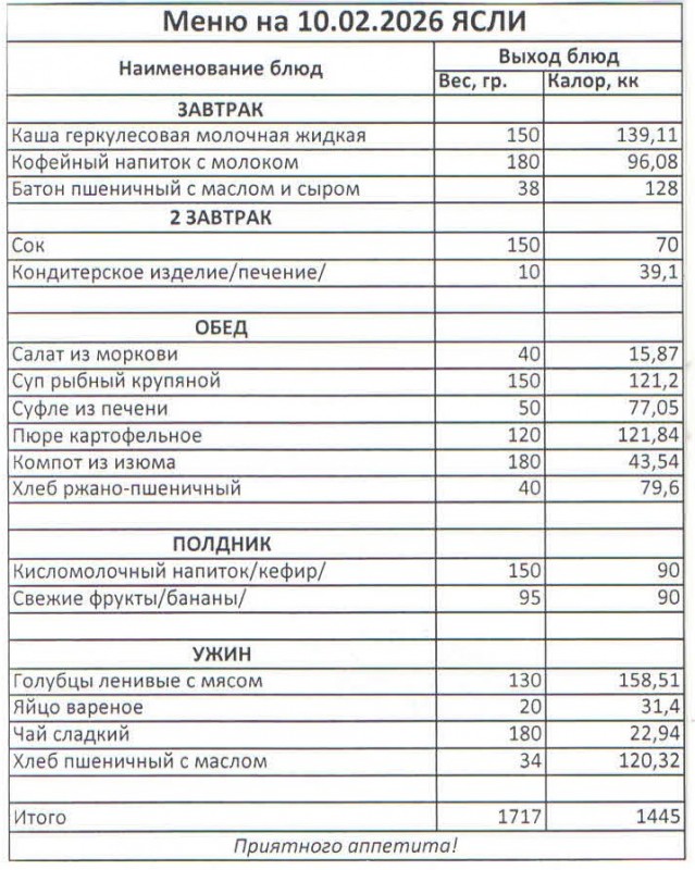 Меню на 10.02.2026 (ясли)