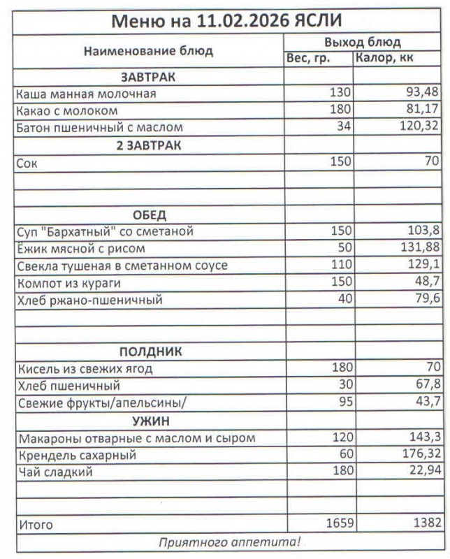 Меню на 11.02.2026 (ясли)