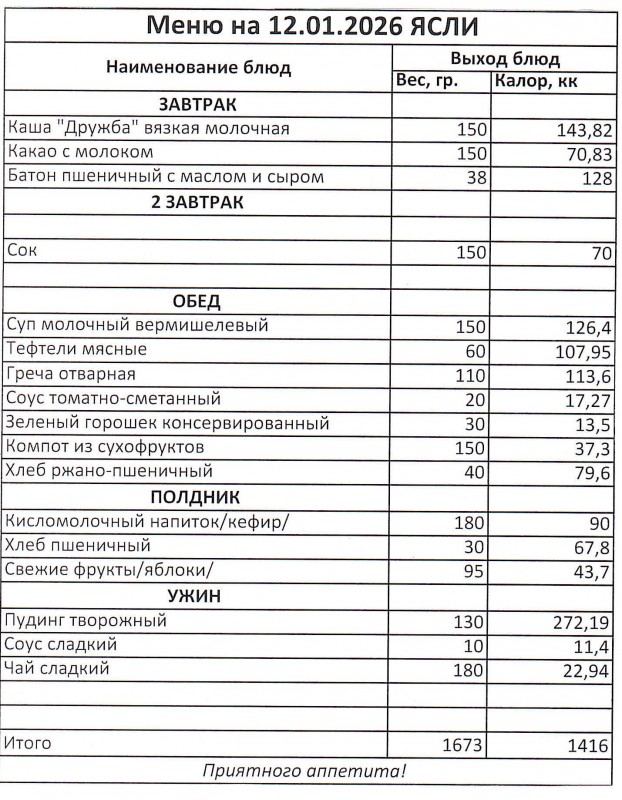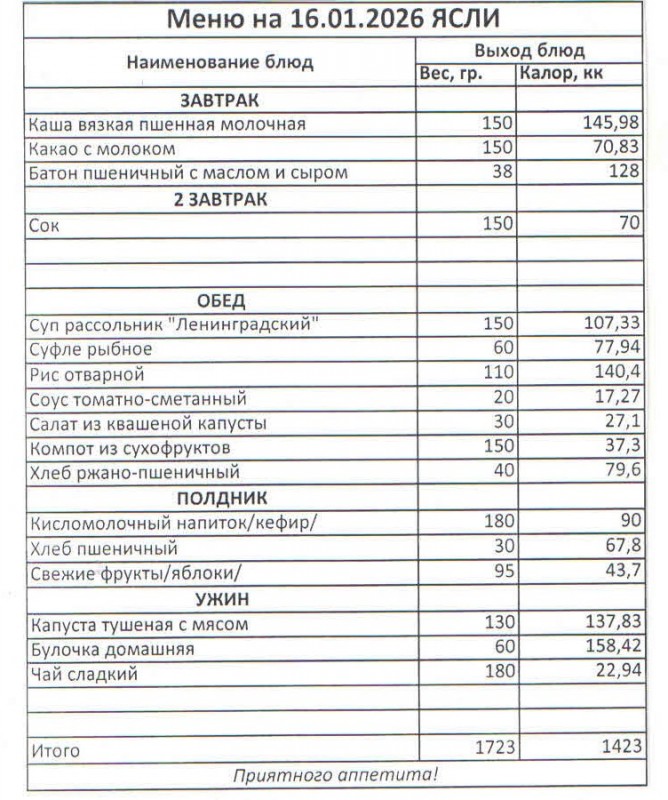 Меню на 16.01.2026 (ясли)