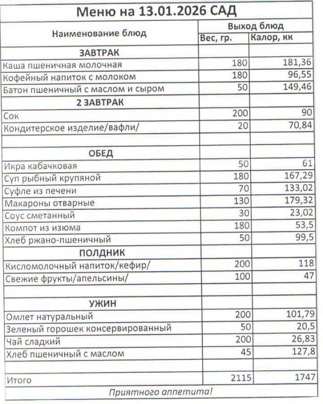Меню на 13.01.2025 (сад)