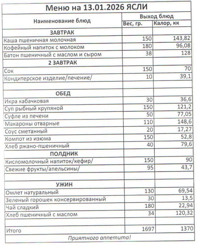 Меню на 13.01.2026 (ясли)