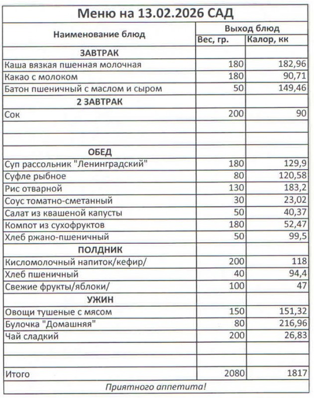 Меню на 13.02.2026 (сад)