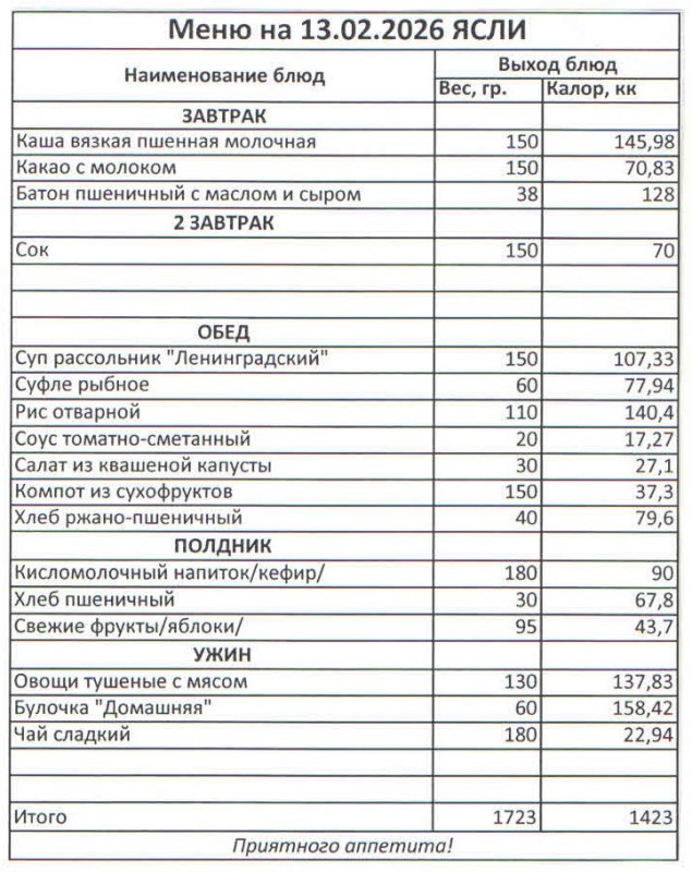 Меню на 13.02.2026 (ясли)