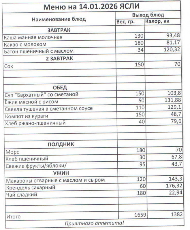 Меню на 14.01.2026 (сад)
