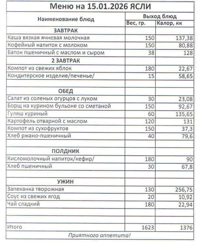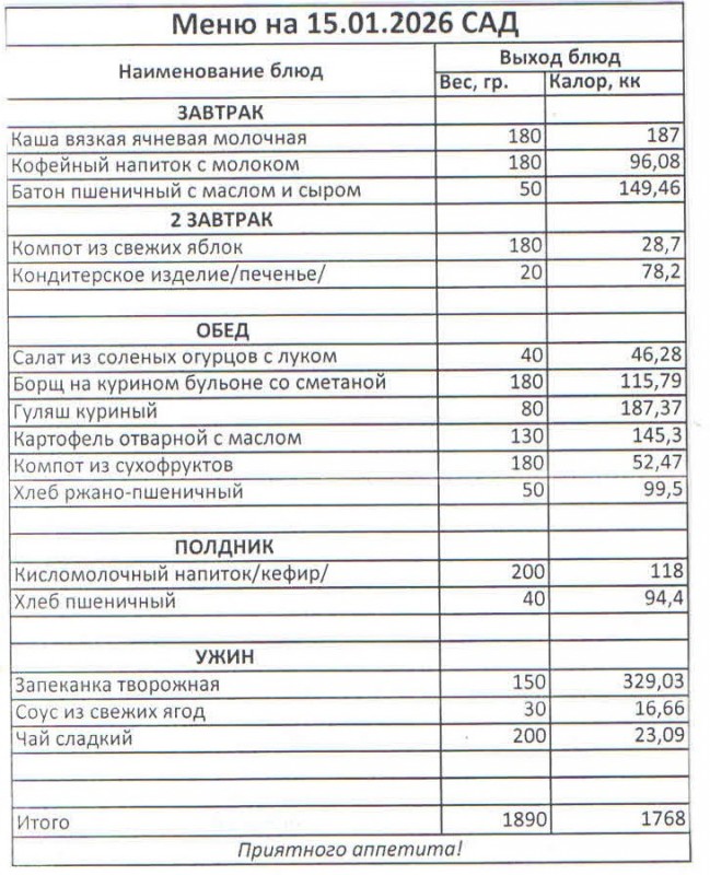 Меню на 15.01.2026 (сад)