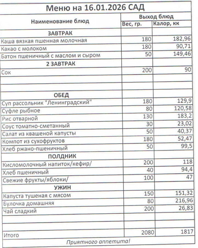 Меню на 16.01.2026 (сад)