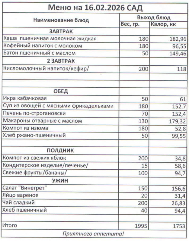 Меню на 16.02.2026 (сад)
