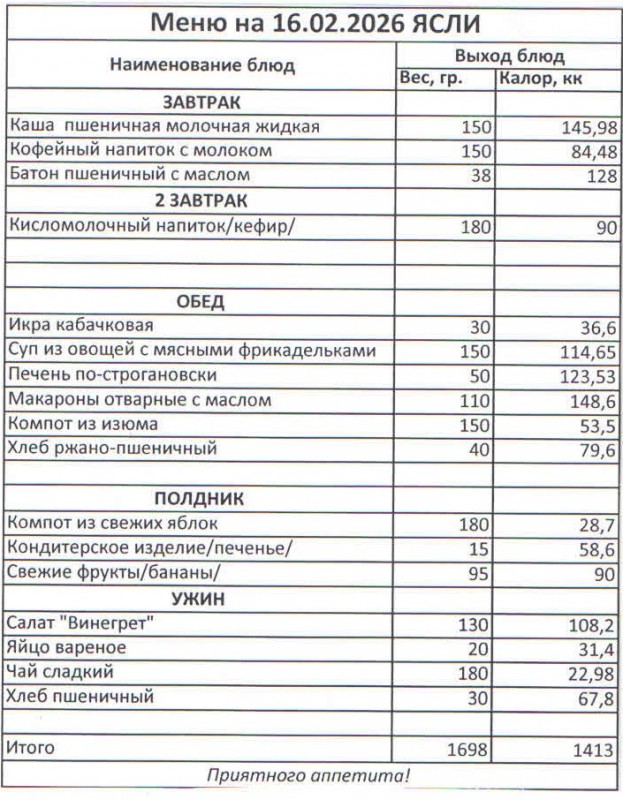Меню на 16.02.2026 (ясли)