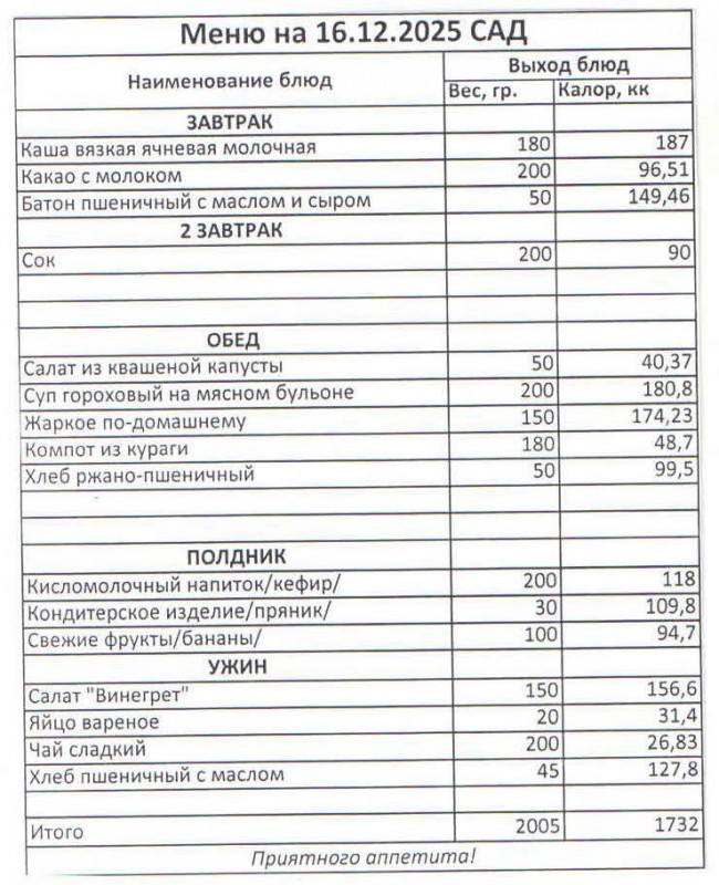 Меню на 16.12.2025 (сад)