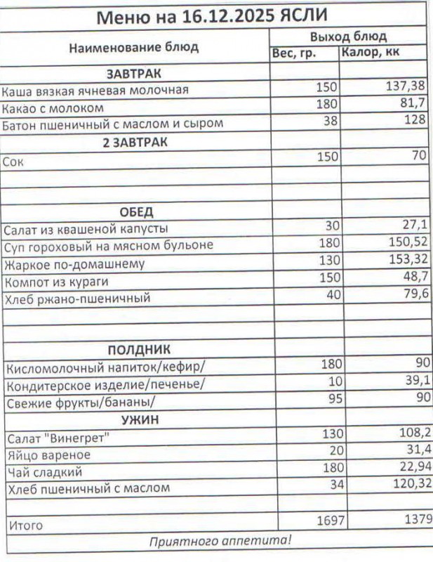Меню на 16.12.2025 (ясли)