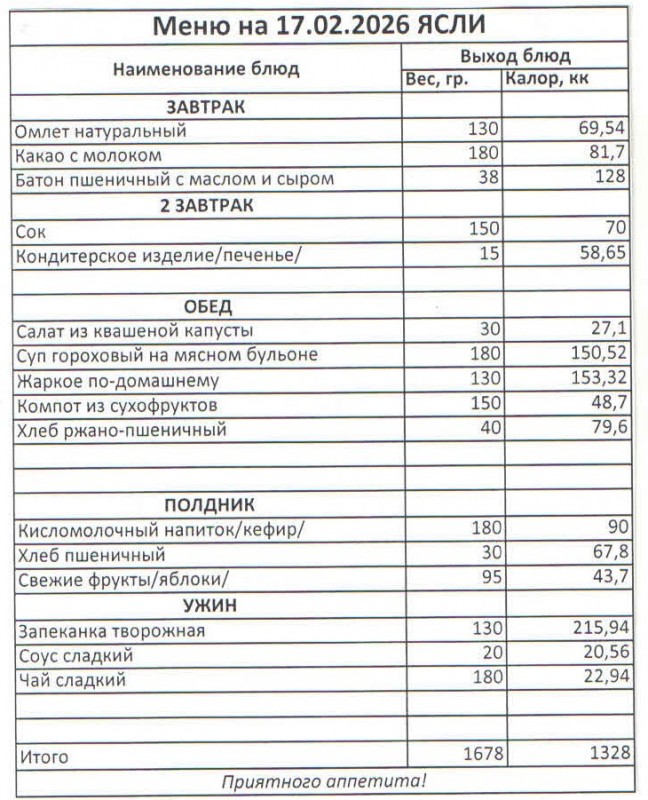 Меню на 17.02.2026 (ясли)