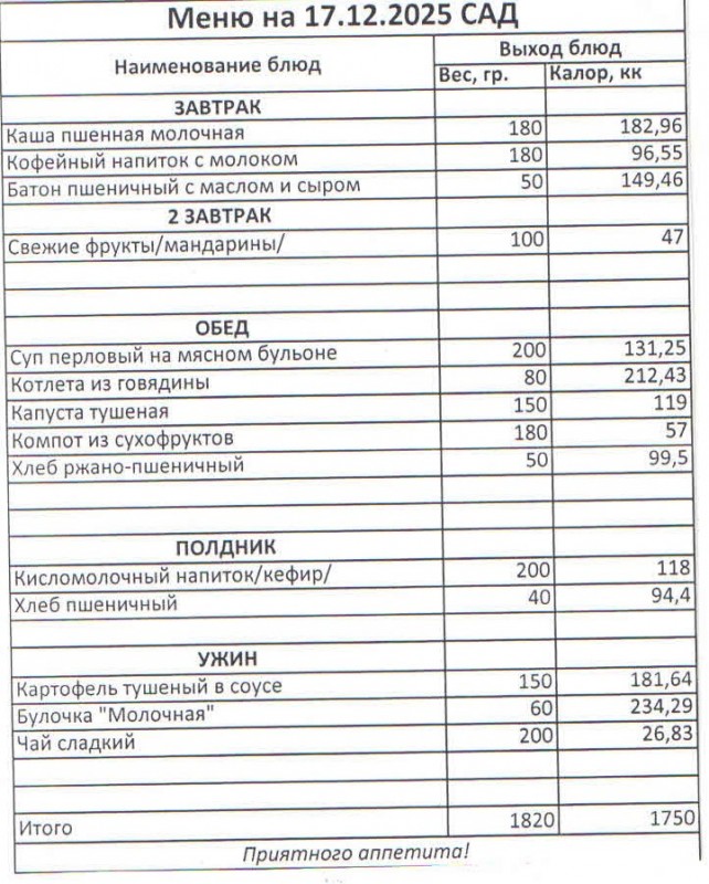 Меню на 17.12.2025 (сад)