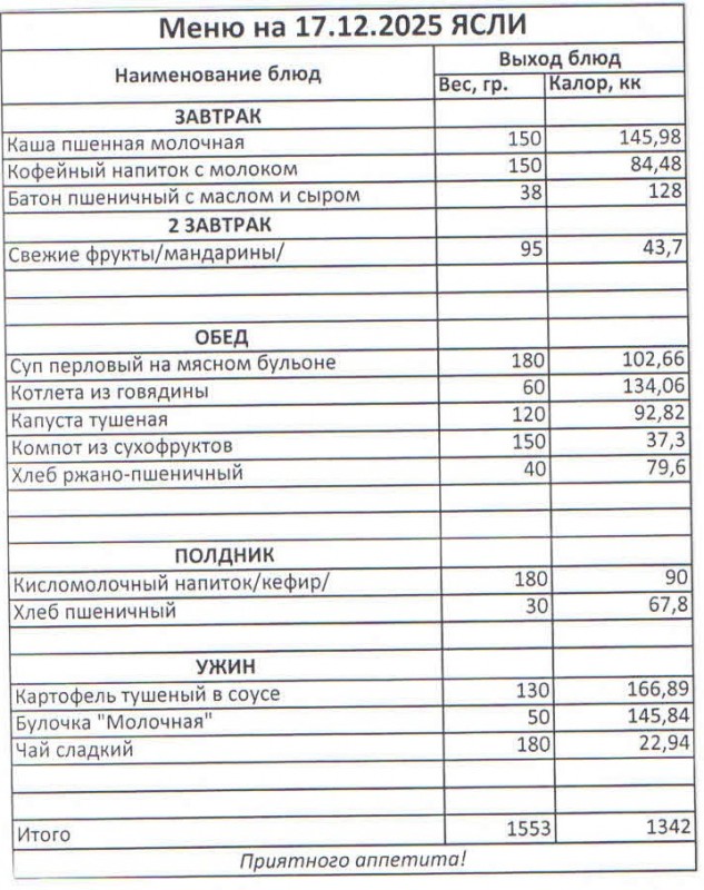 Меню на 17.12.2025 (ясли)