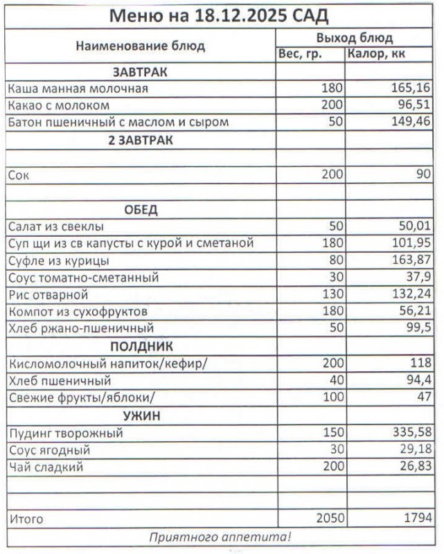 Меню на 18.12.2025 (сад)