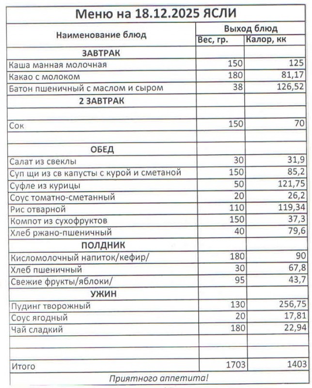 Меню на 18.12.2025 (ясли)