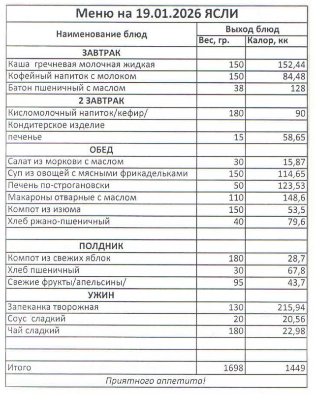 Меню на 19.01.2026 (ясли)