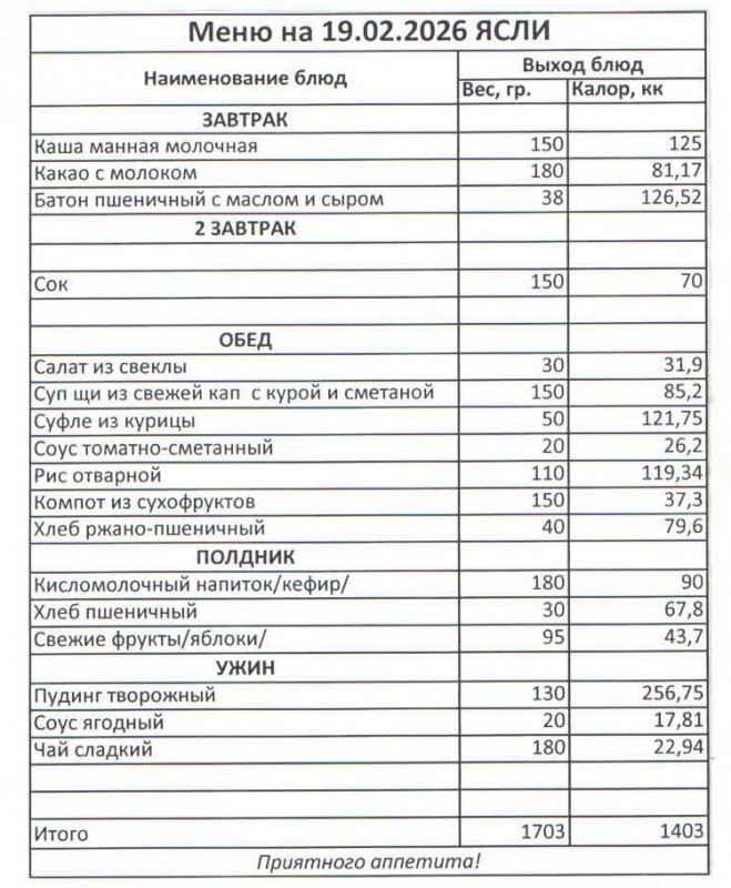 Меню на 19.02.2026 (ясли)