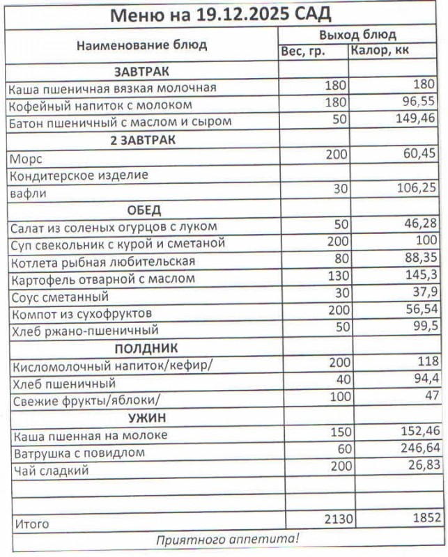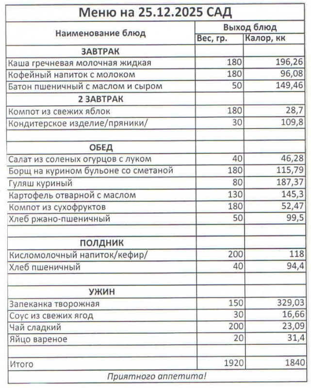 Меню на 25.12.2025 (сад)