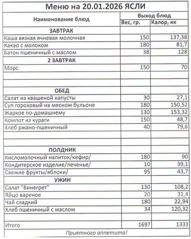 Меню на 20.01.2026 (ясли)