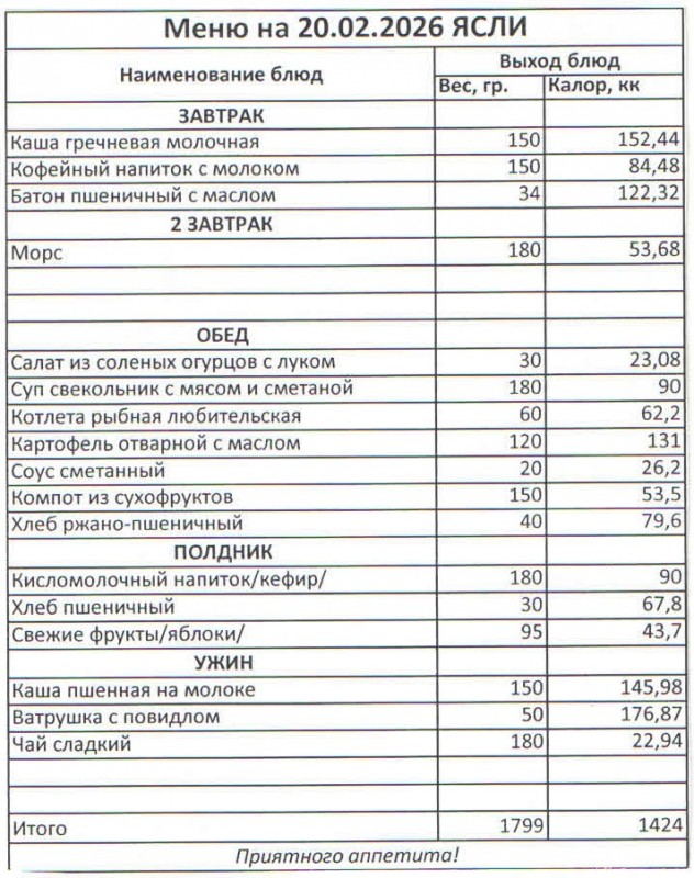 Меню на 20.02.2026 (ясли)