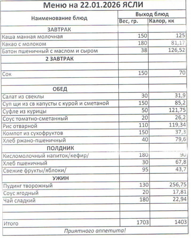 Меню на 22.01.2026 (ясли)