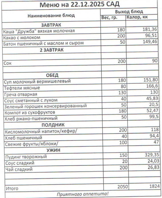 Меню на 22.12.2025 (сад)