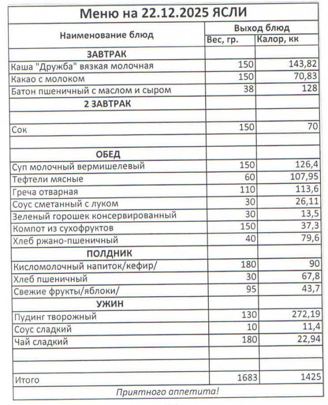 Меню на 22.12.2025 (ясли)