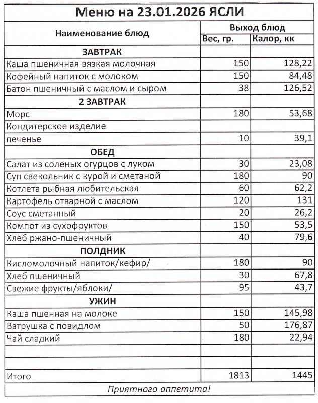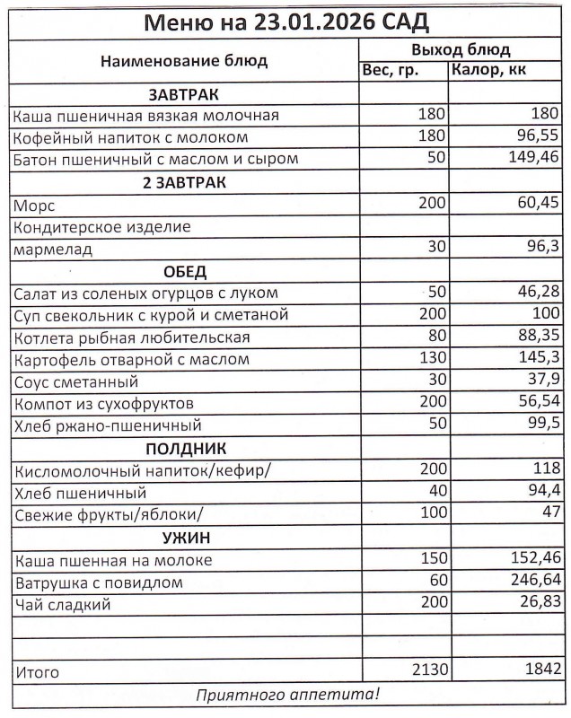Меню на 23.01.2026 (сад)