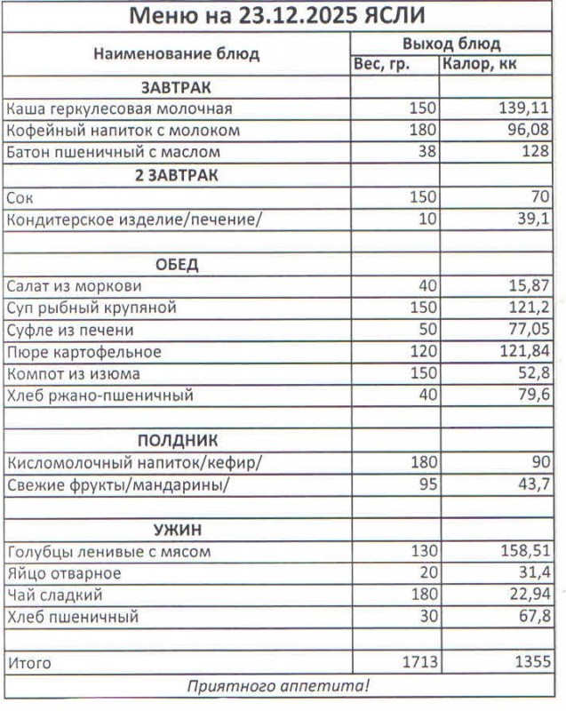 Меню на 23.12.2025 (ясли)