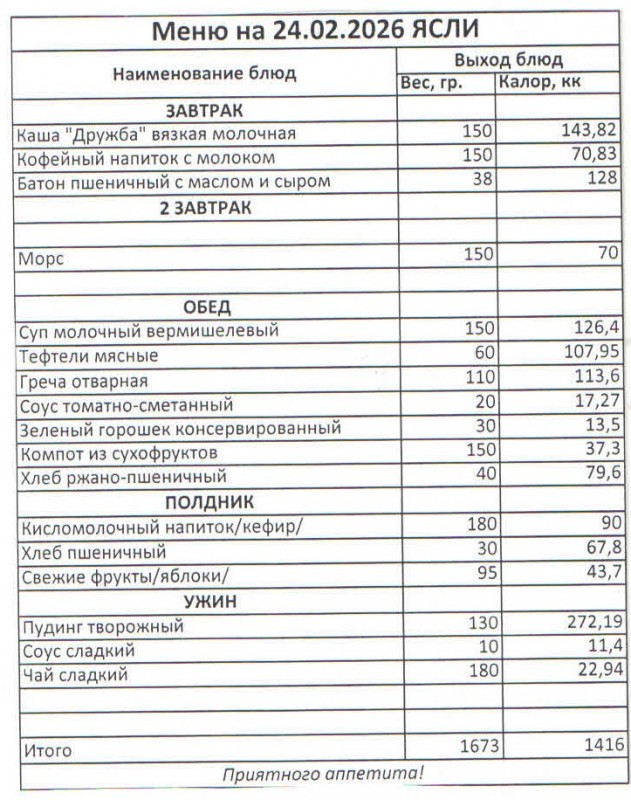 Меню на 24.02.2026 (ясли)