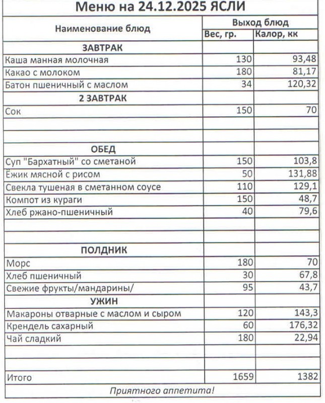 Меню на 24.12.2025 (ясли)