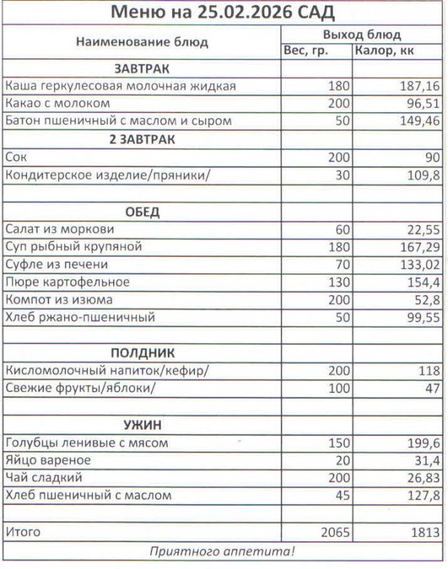 Меню на 25.02.2026 (сад)