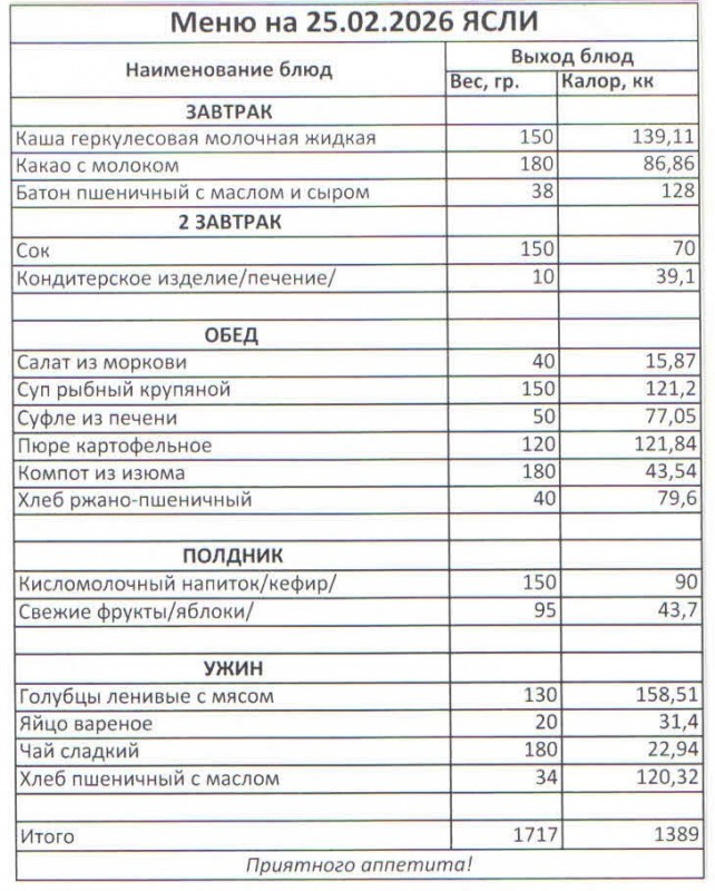 Меню на 25.02.2026 (ясли)