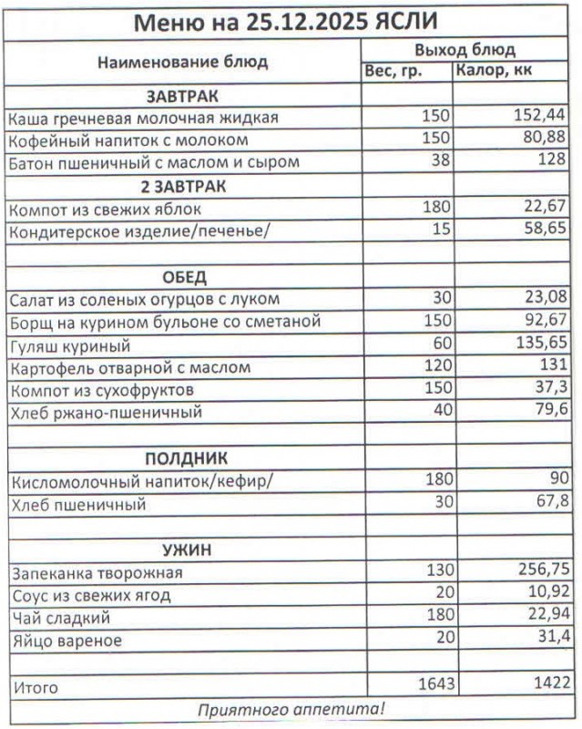 Меню на 25.12.2025 (ясли)