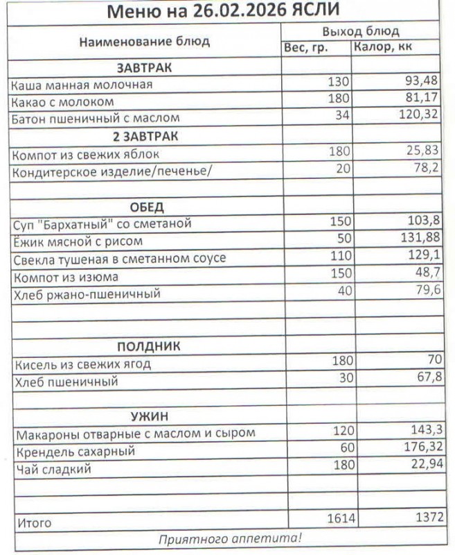 Меню на 26.02.2026 (ясли)