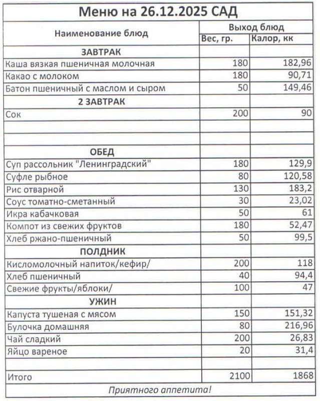 Меню на 26.12.2025 (сад)