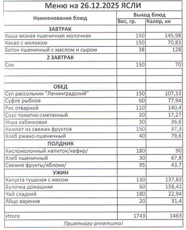 Меню на 26.12.2025 (ясли)