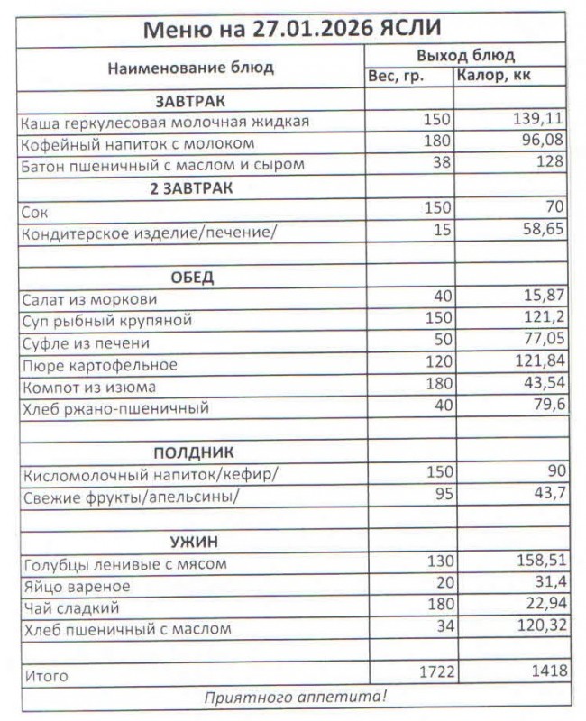 Меню на 27.01.2026 (ясли)