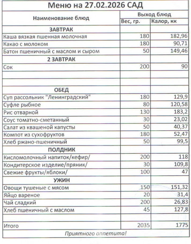 Меню на 27.02.2026 (сад)