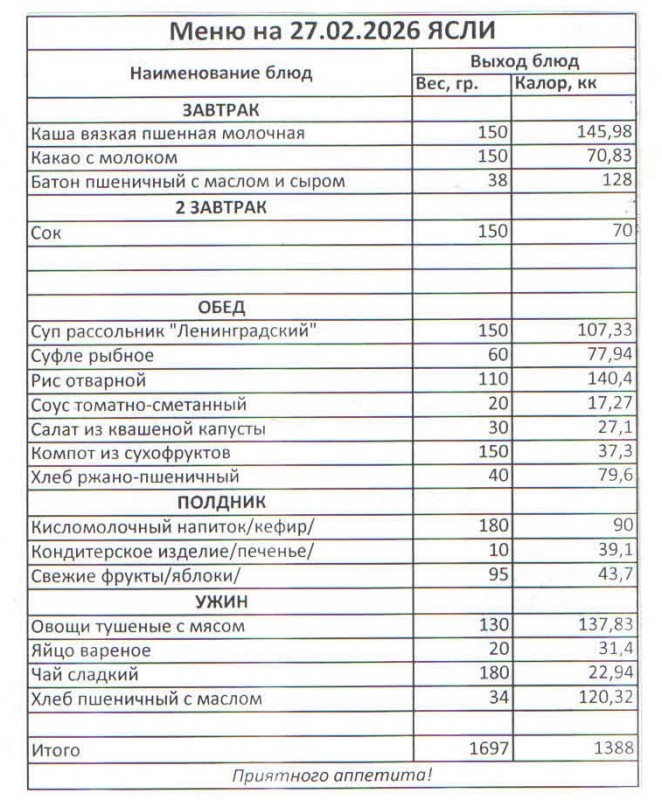 Меню на 27.02.2026 (ясли)