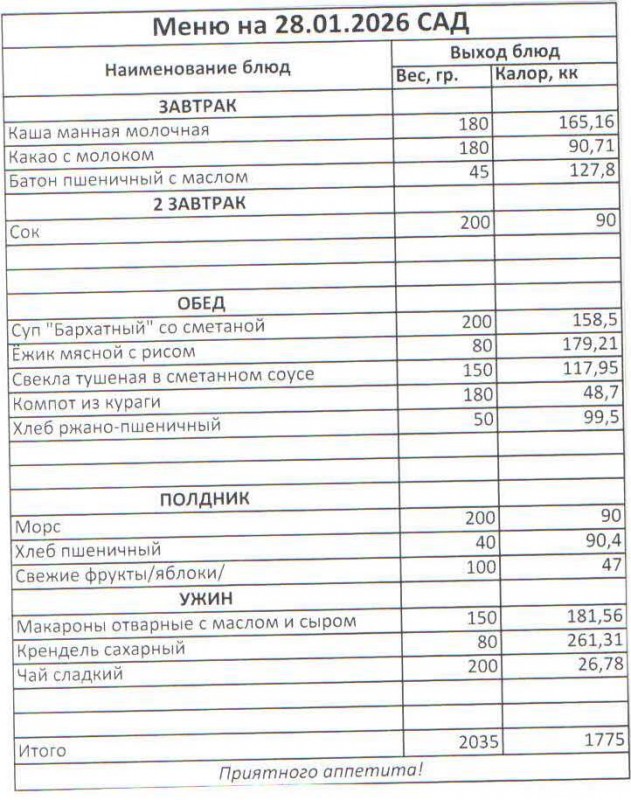 Меню на 28.01.2026 (сад)