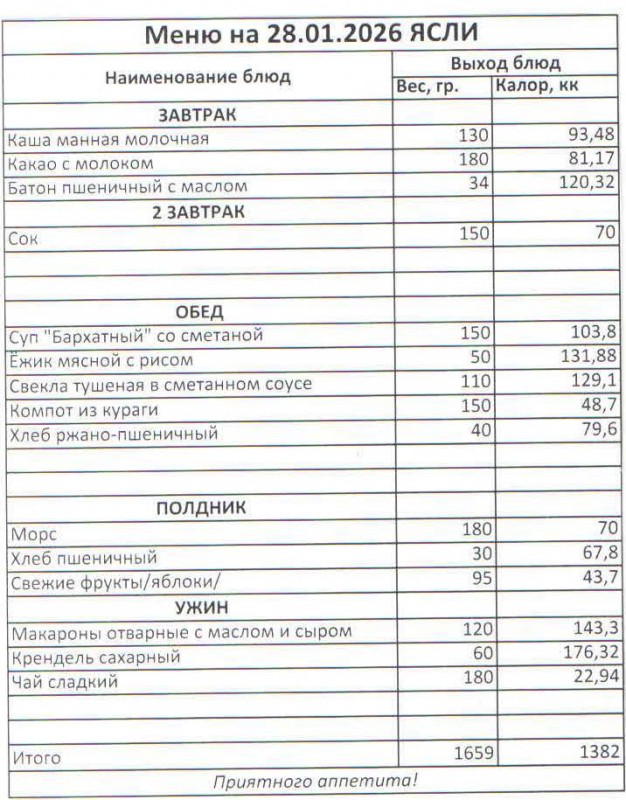 Меню 28.01.2026 (ясли)
