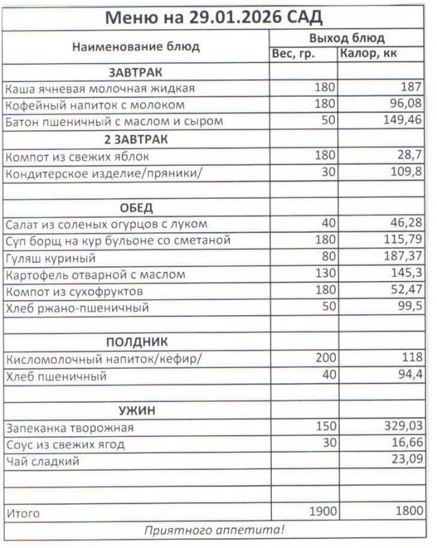 Меню на 29.01.2026 (сад)