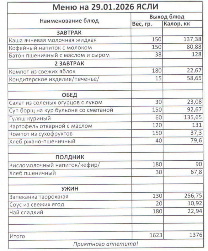 Меню на 29.01.2026 (ясли)