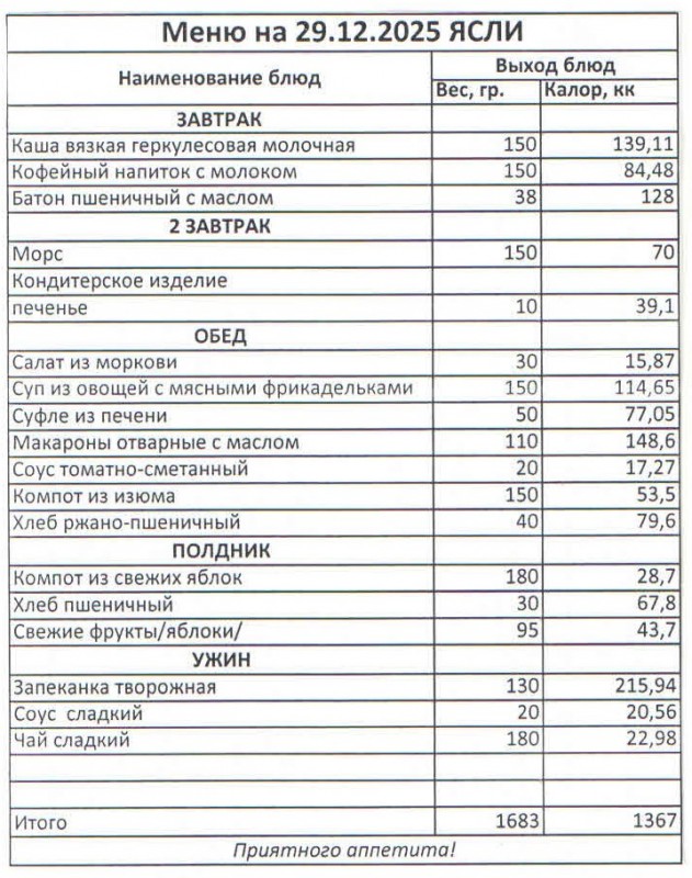 Меню на 29.12.2025 (ясли)